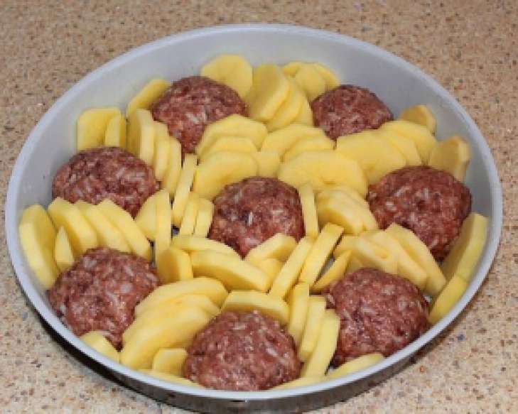 - Наріжте картоплю кружечками. Викладіть картоплю і кульки у змащену олією форму.
