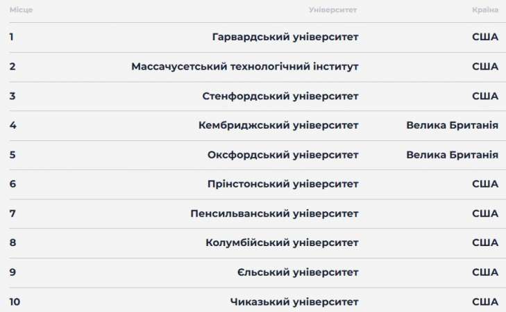 Наведена таблиця демонструє лідерство американських та британських університетів у світовій системі вищої освіти.