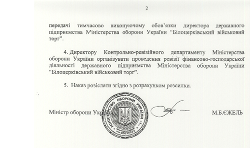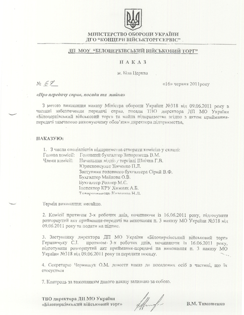 Как оказалось, для военачальников все вышеперечисленное серьезными доводами не является. 9 июня приказом главы ведомства № 318 временно исполняющим обязанности директора ДП МОУ «Белоцерковский военторг» назначается Тимошенко Владимир Николаевич. (см. документ)