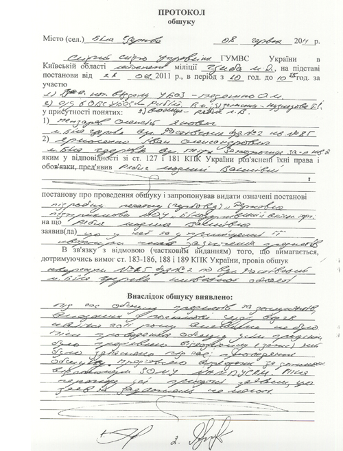 В ходе обыска ее ознакомили с постановлением Шевченковского суда от 28 апреля 2011 года (!!!) разрешившим проведение обыска. (см.документ)