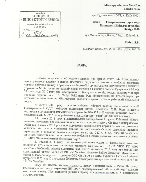Такое же отношение к украинским законам продемонстрировало и Министерство обороны. Получив на руки постановление Подольского райсуда об упразднении уголовного дела в ее отношении, Людмила Рябич обращается к Министру обороны и Генеральному директору концерна «Военторгсервис» с заявлением о восстановлении ее на должности директора ГП МО Украины «Белоцерковский военторг». В концерне заявление Людмилы Васильевны регистрируют 2 июня 2011 года. (см. документ)