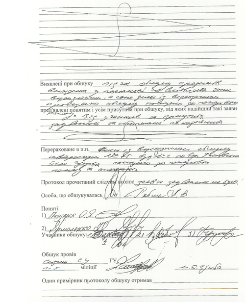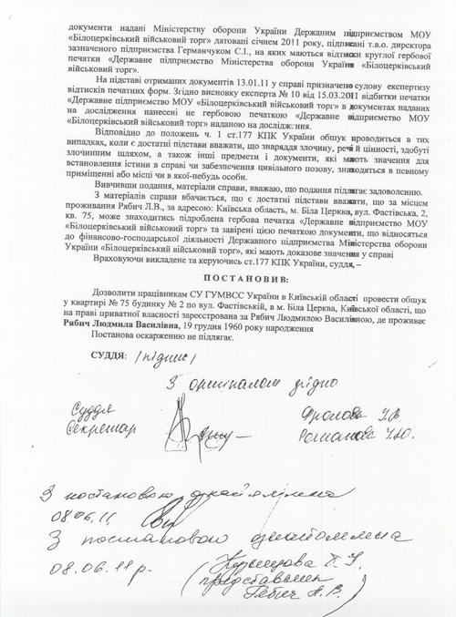 Подтверждают предположения адвоката и дальнейшие действия следователей. После вступления в силу постановления Подольского райсуда, 8 июня на квартире Л.Рябич проводится обыск. (см. документ)