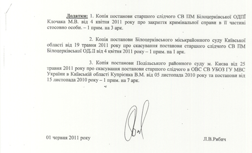Стоит отметить, что для таких предположений есть достаточно веские основания. Потому как постановлением Подольского районного суда города Киева от 25 мая 2011 года упразднено постановление следователя о возбуждении уголовного дела в отношении Людмилы Рябич. «Суд пришел к выводу, что в материалах, представленных суду, и на основании которых были возбуждены уголовные дела относительно Рябич Л.В. не содержат достаточных данных, которые указывают на наличие в ее действиях признаков данного преступления», - говорится в решении суда. Также указан в документе и немаловажный момент – «подача апелляции не останавливает постановлении судьи». (см. документ ниже)