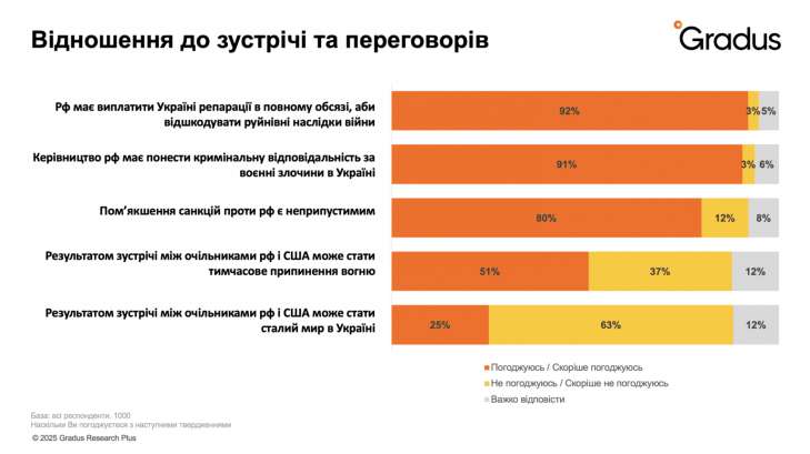 Абсолютное большинство также настаивает на ответственности агрессора: 92% считают, что РФ должна выплатить Украине репарации в полном объеме для возмещения разрушительных последствий войны, а 91% убеждены, что руководство РФ должно понести уголовную ответственность за военные преступления в Украине.