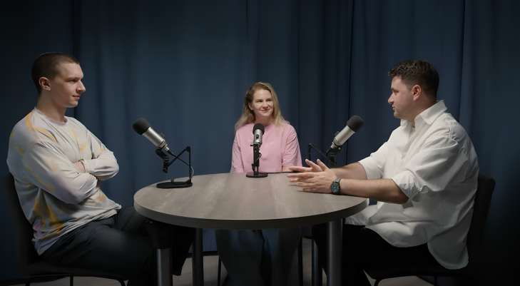 Фото: ведучі подкасту Антон Полєсков та Ілля Кабачинський з Оленою Руденко — Data Analyst в Djinni.co