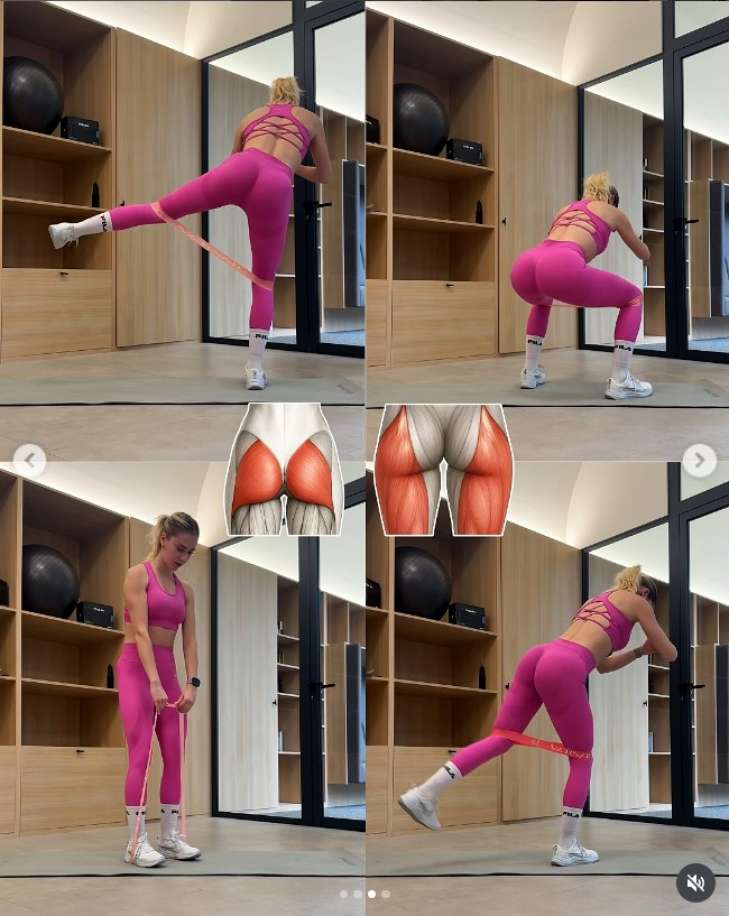 Закріпіть резинку на щиколотці. Відводьте ногу назад, убік або комбінуйте ці рухи. Працюють саме м'язи сідниць. Підходить як для залу, так і домашніх тренувань.