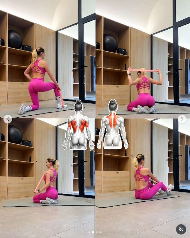 Сядьте на підлогу або килимок. Одну руку зафіксуйте. Іншою - тягніть резинку вгору й трохи назад так ніби хочете "відкрити" плече. Рух має бути плавним, без ривків. Ліктьовий суглоб трохи зігнутий. Відчуєте, як працює задня частина плеча.