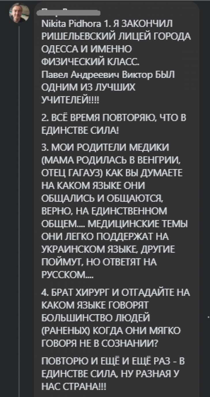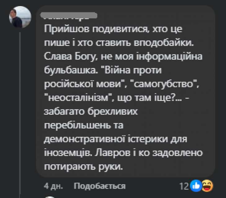“Прийшов подивитися, хто це пише і хто ставить вподобайки. Слава Богу, не моя інформаційна бульбашка. “Війна проти російської мови”, “самогубство”, “неосталінізм”, що там іще?… – забагато брехливих перебільшень та демонстративної істерики для іноземців. Лавров і ко задовлено потирають руки”, – вказано в одному з коментарів.