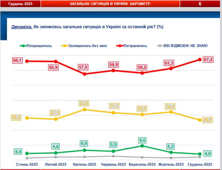 Согласно опросу относительно общей ситуации в Украине, количество людей, которые считают, что она движется в неправильном направлении составляет 58%, в то же время 32% считают направление развития правильным.