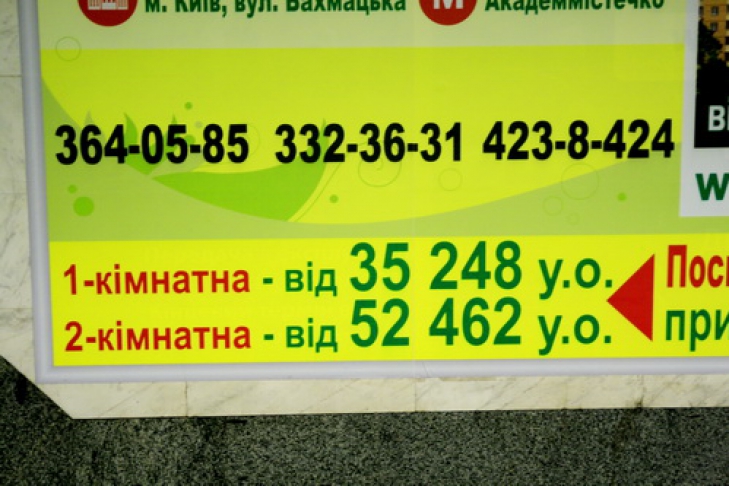 И все же реклама с цифрами есть – жилой недвижимости. Присмотревшись к ней, «Багнет» обнаружил предложения со стоимостью «квардрата» в 6500, 8000, 9600 и 12800 гривен. Ритейлеры, предлагающие жилье за «у.е», на «квадраты» не размениваются и указывают на плакатах стоимость квартиры, например, однокомнатной – «от 35 248 у.о», а двухкомнатной – «от 52 462 у.о». Встречаются плакаты и без указания «квадрат» это или квартира, - а просто - «от 28 000 у.о».