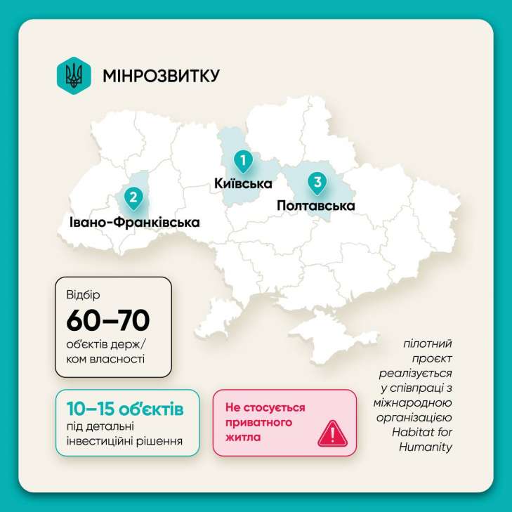 Ініціатива реалізується у співпраці з міжнародною організацією Habitat for Humanity на виконання Закону №4080. Пілотний етап відбудеться у Київській, Івано-Франківській та Полтавській областях. Планується відібрати 60–70 об’єктів, із яких 10–15 підготують для детальних інвестиційних рішень щодо реконструкції.