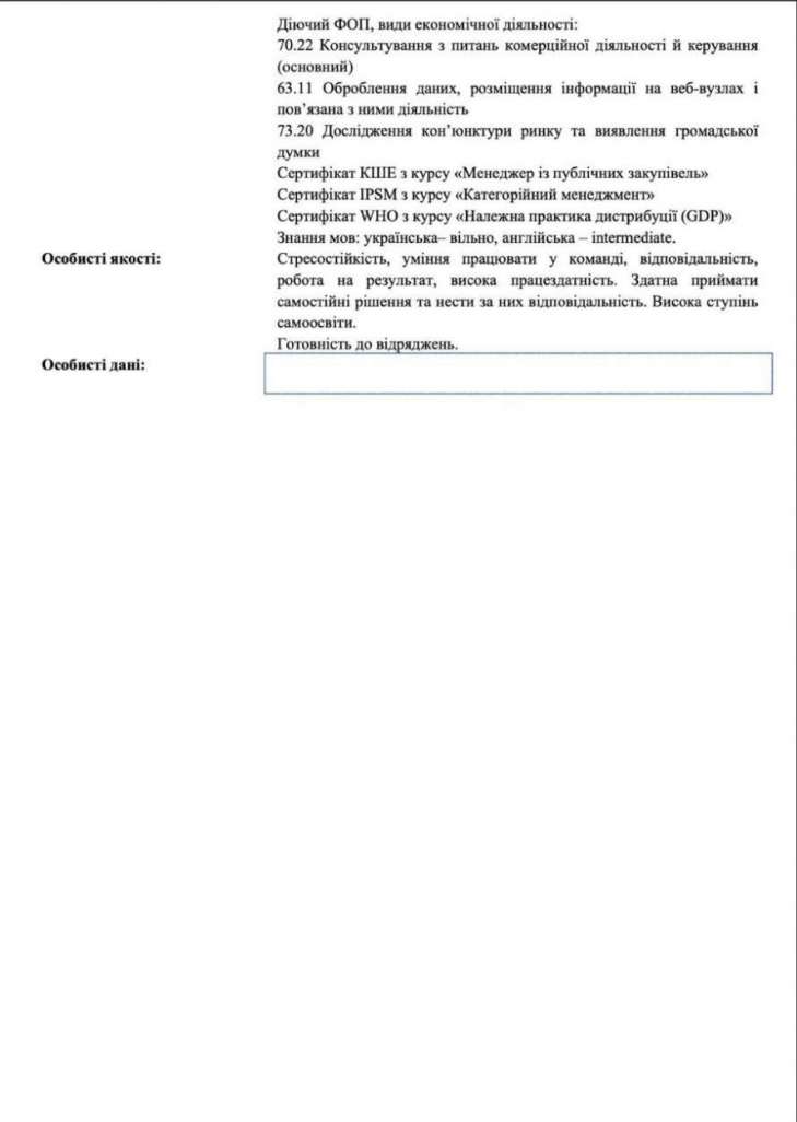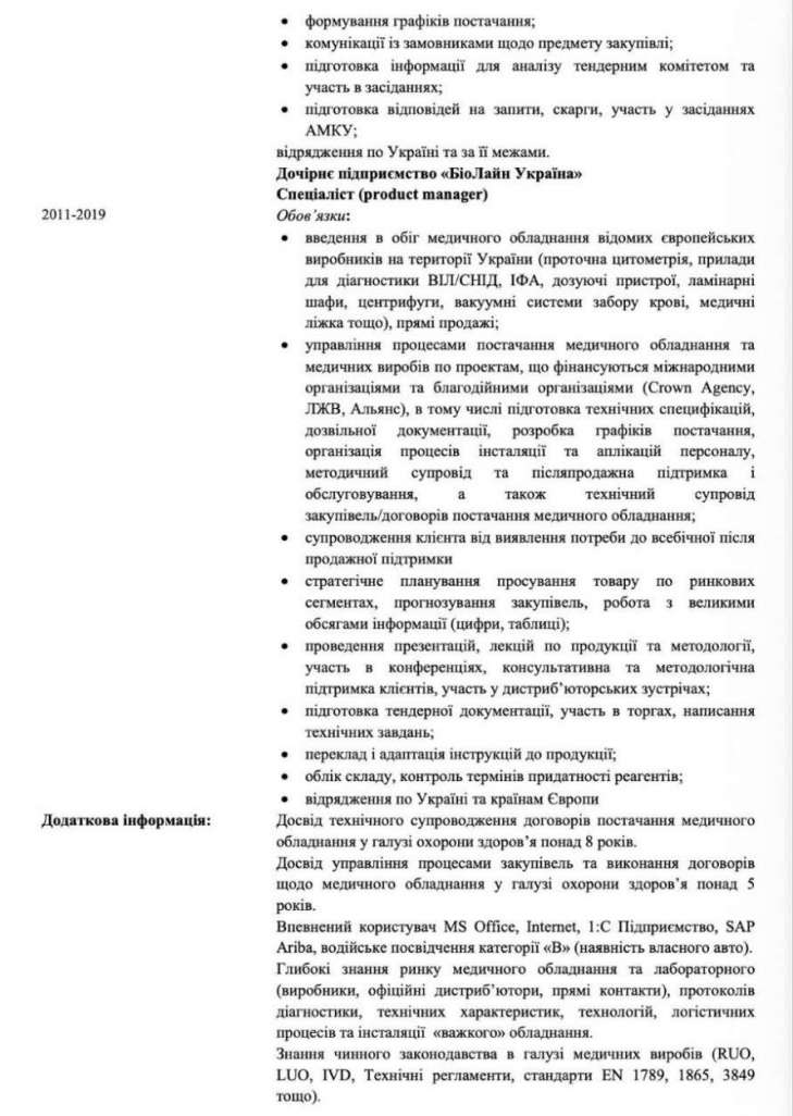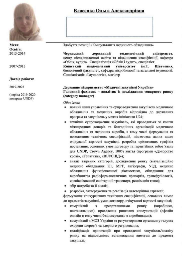 Приховування даних: У своєму резюме для Світового банку Власенко вказала досвід роботи в ДП "Медичні закупівлі України" (2019–2025), але повністю приховала співпрацю з Protech Solutions.