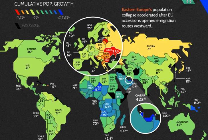 Натомість лідерами зростання населення стали Катар (+423,4%), ОАЕ (+249,7%) та Екваторіальна Гвінея (+166,6%).