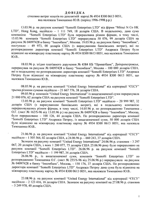 Тимошенко, следует напомнить, неоднократно снимала значительные суммы в банкоматах в Киеве, пользовалась своей «инкомбанковской» карточкой в различных европейских странах, США, Объединенных Арабских Эмиратах, Турции. Совокупная сумма расходов Тимошенко в 1996 – 1999 годах составила «всего-то» 908 тысяч долларов. Красиво жить не запретишь? Скажите, уважаемый читатель, Вы верите, что Юлия Владимировна тратила последнее? Она ведь покупала далеко не хлеб и молоко, а была клиенткой дорогих магазинов и роскошных ресторанов.