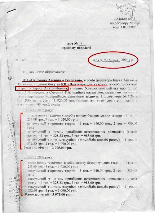 Алексей Давыденко предоставил «Багнету» документы (акт приема-передачи), из которых следует, что Тарас Смурный в 2008 году передал ЧП «Охранное агентство «Тамерлан» 11 925 грн. за предоставление таких услуг, как «консультации по продаже животных», «консультации по вопросу закупки автомобилей» и др.