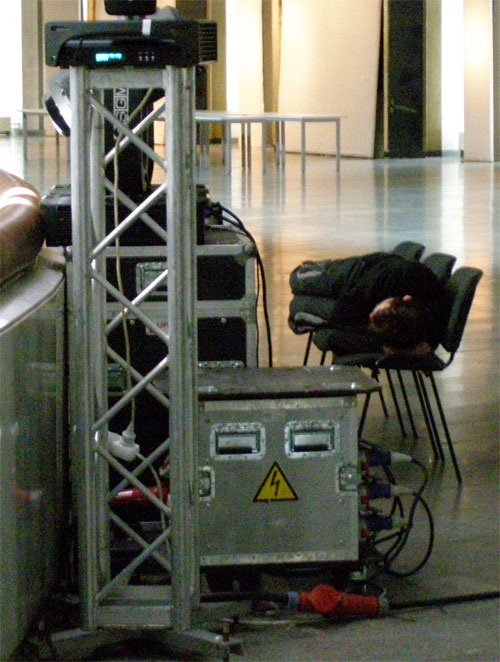 Оказалось, что не всем интересно современное отечественное монументальное искусство. Видать, оно имеет парадоксальное влияние на некоторых людей. В частности на оператора осветительного пульта, который так насмотрелся на мегашедевры, что его одолел сон. Причем такой крепкий, что даже фотовспышка не смогла разбудить спящего.