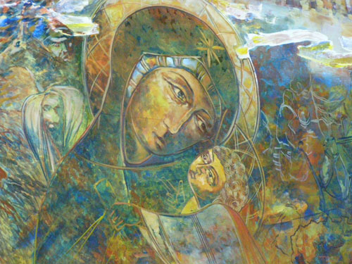 Центральное место полотна занимает изображение Богородицы-Оранты.