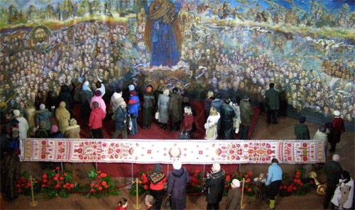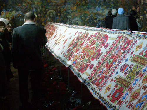 Перед картиной посетители могут ознакомиться с плодом коллективного творчества, который организаторы выставки считают самым длинным рушником в мире.