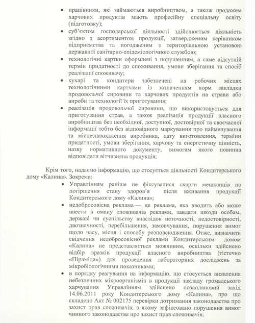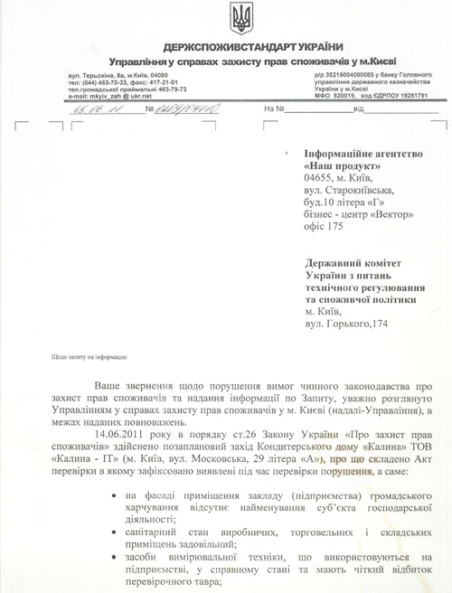 Когда результаты экспертиз стали достоянием общественности, первыми на выявленные нарушения отреагировали специалисты Управления по делам защиты прав потребителей в г. Киеве. Они провели внеплановую проверку кондитерского дома «Калина». (см. документ)
