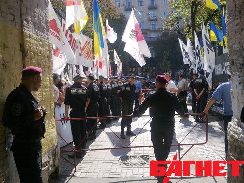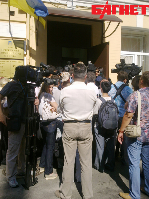 С самого утра вход в арку, ведущую к зданию Печерского суда, заняли правоохранители. Порядка 20 милиционеров стояли на Крещатике, еще несколько – во дворе. Немного позднее к участку улицы Богдана Хмельницкого, через дорогу от ЦУМа, подтянулись несколько автобусов с упакованными в бронежилеты «боевиками». Вели они себя, правда, очень мирно, праздно рассматривая проходящих мимо людей и поедая мороженое, купленное в расположенном неподалеку киоске.