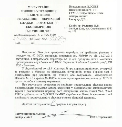 В нашем распоряжении оказались документы, подтверждающие информацию о том, что Управлением государственной службы по борьбе с экономическими преступлениями Главного управления МВД Украины в городе Киеве начата проверка на предмет возможных противоправных действий должностных лиц Кабинета Министров Украины, Черкасской областной администрации и предприятия СП ООО «Венето». Об этом сделана соответствующая запись в Журнале регистрации заявлений и сообщений о совершенных или готовящихся преступлениях. (см. документ)