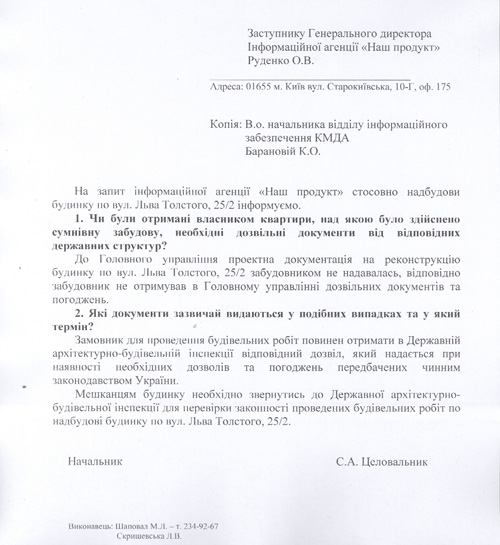 Как и следовало ожидать, никакого разрешения на подобные архитектурные работы по указанному адресу необходимых разрешений выдано не было. В ответ на соответствующий запрос Главное управление градостроения и архитектуры Киева дало вполне исчерпывающий ответ (см. фото документа, полученного редакцией ИА «Наш Продукт» по электронной почте).