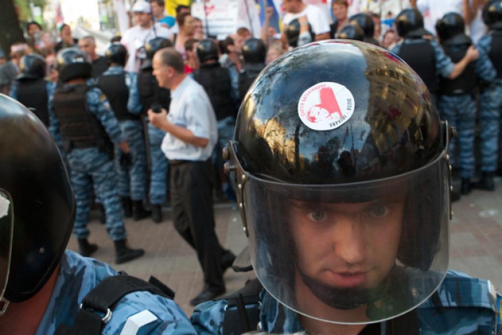 Сторонники лидера партии «Батькивщина» Юлии Тимошенко под Печерским судом обклеили бойцов «Беркута» наклейками с символикой партии и изображением ее лидера.