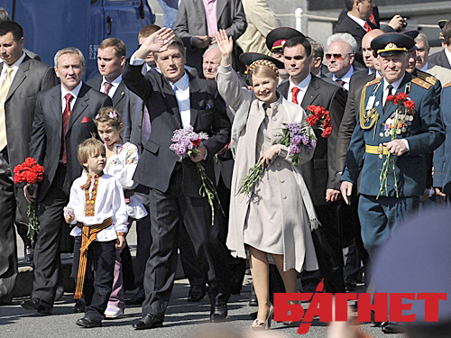 И вот парад начался. В торжественном прохождении по Крещатику приняли участие президент Украины Виктор Ющенко со своей семьей, премьер-министр Юлия Тимошенко, министр обороны Юрий Ехануров, киевский мэр Леонид Черновецкий, представители центральных органов власти, народные депутаты, активисты ветеранских организаций.