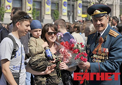 К счастью, светлый праздник Победы не омрачили ни плохая погода, ни публичные ссоры политиков. Корреспонденты «Багнета» смогли в этом убедиться лично. Несмотря на достаточно ранний час, как для субботнего утра, Крещатик был переполнен желающими сказать теплые слова ветеранам, подбодрить их, подарить цветы.