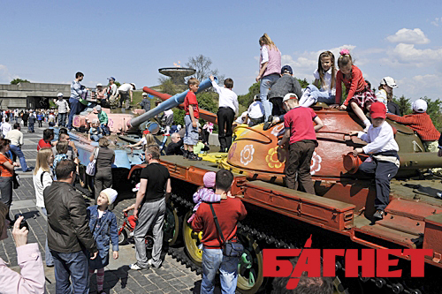 Пожалуй, одним из самых символичных моментов празднования Дня победы стали разрисованные в голубой и оранжевый цвета танки у Мемориального комплекса «Национальный музей истории Великой Отечественной войны 1941-1945 годов». Два танка разукрашенные ромашками облюбовала детвора, с радостными криками забираясь на них и прыгая.