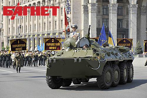 Во главе колонны ехал бронетранспортер, а за ним шли военные со штандартами 1, 2, 3 и 4 украинских фронтов