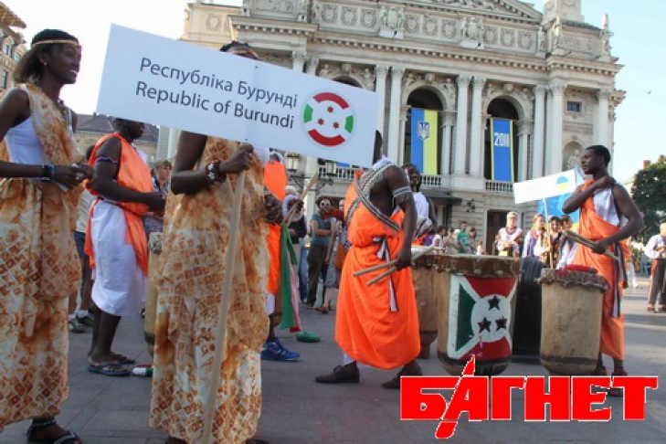 В честь юбилея Независимости по Львову прошлись французы на ходулях и африканцы с барабанами (ФОТО)