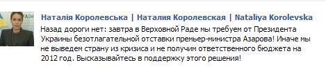 «Назад дороги нет: завтра в Верховной Раде мы требуем от Президента Украины безотлагательной отставки премьер-министра Азарова!», - написала она.