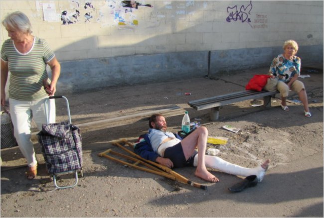По словам очевидцев, мужчина не мог говорить и не в состоянии был сдвинуться с места: в гипсе нога и живот. Прохожие обзвонили всевозможные городские инстанции, чтобы помочь калеке, но нигде не находят понимания.