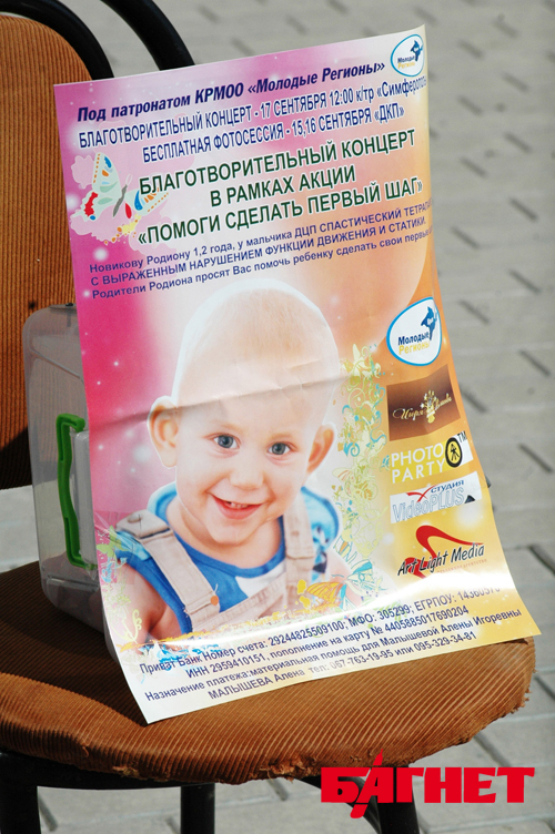Целью подобного мероприятия стал сбор средств для Родиона Новикова (1,2 года), которому врачи поставили диагноз детски церебральный паралич с нарушением функции движения. Другими словами, ребенок не в состоянии сделать свой первый шаг. Медики говорят, что исправить ситуацию можно, но на операцию нужно немало средств – ее стоимость исчисляется десятками тысяч долларов. Естественно у родителей малыша просто нет таких денег, поэтому они и обратились в общественные организации.