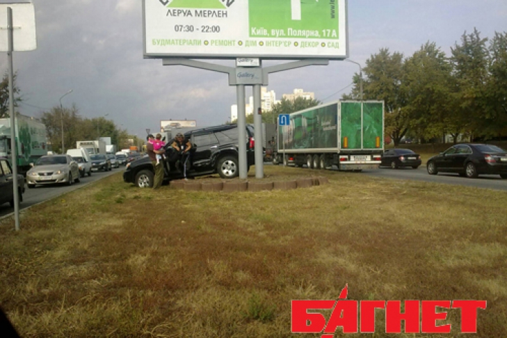 Сегодня, 5 октября, в Киеве около дух часов дня на ул. Богатырской произошло ДТП, заставившее мимо проезжающие авто сбавлять скорость, в результате чего возникла тянучка. Как сообщил корреспондент «Багнета», оказавшийся на месте событий, водитель внедорожника не справился с управлением, объезжая выскочившую на дорогу кошку. Вследствие этого его авто выбросило на разделительный газон, где «неудачно» расположились клуба и рекламный щит.