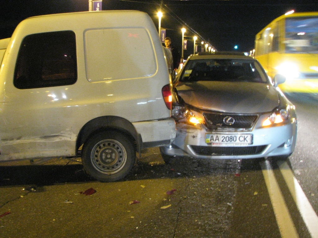 В субботу вечером 8 октября на мосту им.Патона столкнулись Lexus, Volkswagen Caddy и Chevrolet Aveo.