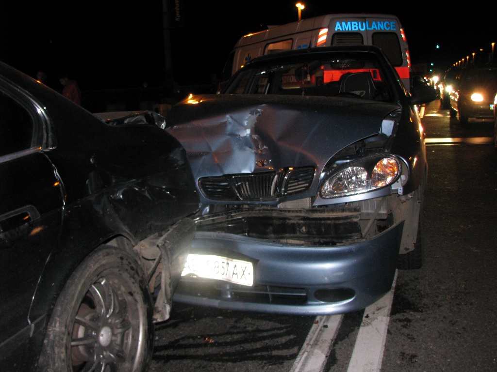 Несколько позднее на этом же мосту случилось еще одно «групповое ДТП». Столкнулись тра автомобіля: Daewoo Lanos, BMW 5 и Subaru Legasy.