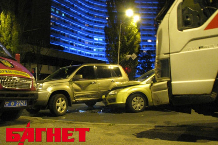 В субботу поздно вечером, 8 октября, на Русановской набережной в Киеве столкнулись Ford Focus и Nissan X-trail.