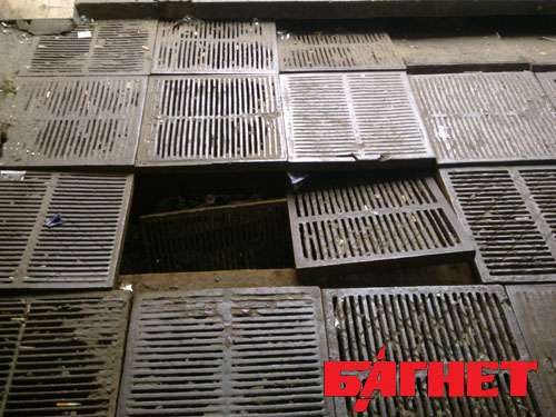 В подземном переходе возле метро «Шулявская» со стороны Киностудии им. Александра Довженко серьезно повреждены канализационные решетки. Две секции практически полностью провалились вовнутрь, а одну кто-то сорвал и положил рядом с образовавшейся дырой.