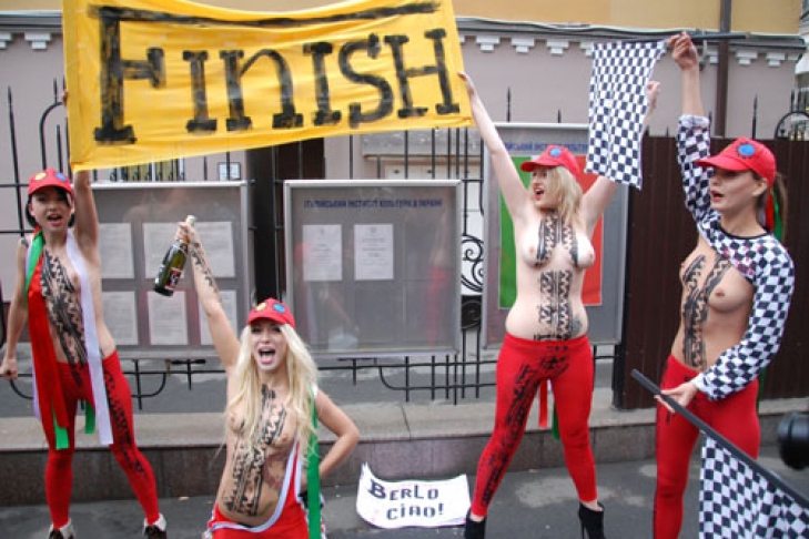 Активистки женского движения FEMEN отпраздновали отставку премьер-министра Италии Сильвио Берлускони, устроив настоящий дебош триумфаторов в стиле гонки Формула-1 у стен итальянского посольства в Киеве.