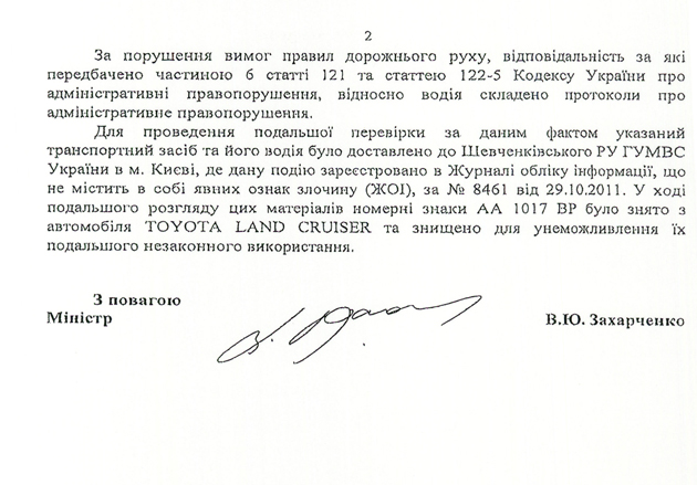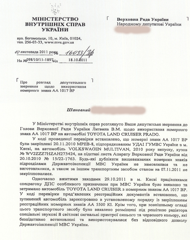 В распоряжении «Багнета» оказался любопытный документ, а именно – ответ министра внутренних дел Украины Виталия Захарченко на запрос одно из народных депутатов. Народный избранник просит ведомство предоставить информацию об использовании «крутого» государственного номерного знака «АА1017ВР» на автомобиле «Тойота Ленд Крузер» (см. фото документа ниже). И хотя милиция уже давно отрапортовала, что «модные» серии типа «ВР», «ОО», «МИ» не выдаются, а те, что используются – никаких привилегий владельцу не дают, ситуация к лучшему не изменилась.