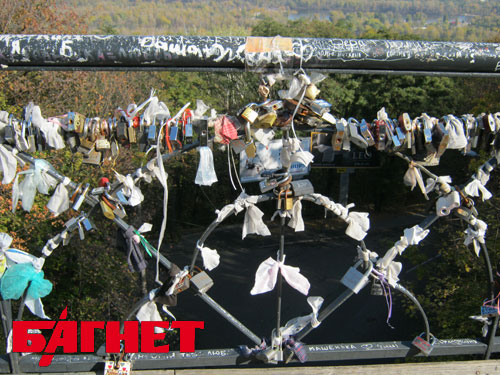 Он же Пешеходный мост, он же Мост самоубийц, он же Парковый мост. К строительству этого сооружения приложил руку небезызвестный Евгений Патон. А с относительно недавнего времени мост стал своеобразным памятником чувствам влюбленных пар. К слову, эта идея далеко не нова – аналогичные мосты есть во многих городах мира. Молодые люди в знак своей любви вешают на перила «памятника» замки. Особенно популярна эта традиция у молодоженов. Впрочем, у романтического сооружения есть и обратная сторона. Особо оригинальные влюбленные не могут придумать ничего лучшего, чем «украсить» перила моста носовыми платками, нижним бельем и даже гигиеническими прокладками, что вызывает законное возмущение окружающих. Также некоторые опасения вызывает количество «любовных оков». Ведь рано или поздно их масса может стать критической, сделав прогулку по посту любви делом рискованным и даже опасным. Так что для сохранения моста влюбленным, чьи чувства не прошли проверку временем, скептики предлагают самостоятельно убирать ненужные уже замки.