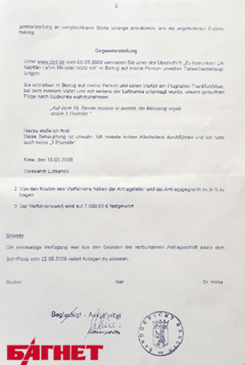 «Опровержение: В выпуске www.bild.de. От 05.05.2009 Вы распространяете неправдивые факты относительно моей личности под названием: Zu betrunken! LH-kapitan nahm Minister nicht mit: Относительно моей личности и в связи с инцидентом в аэропорту Франкфурта-на-Майне, во время которого мне и моему отцу отказали в посадке на рейс компании «Люфтганза» в Южную Корею, билеты на который были забронированы предварительно, Вы пишете: «В 19 отделении полиции от должен был дунуть, измерение показало 3 промиле алкоголя». Для этого я констатирую: Это предположение является неправдивым. Меня не принуждали проходить тест на содержание алкоголя, а также я не был пьян (не имел «3 промиле»). Киев, 15.05.2009 Александр Луценко».