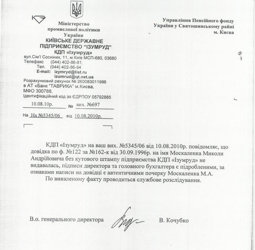 Немногим позже стало понятно, что на справке о командировке афериста были подделаны подпись директора и главного бухгалтера. А почерк, которым была сделана подделка, очень похож на стиль письма Москаленко. Так была выявлена эта афера, давшая возможность заместителю Николая Катеринчука 14 лет незаконно получать пенсию чернобыльца и инвалида 2 группы.(см документы)