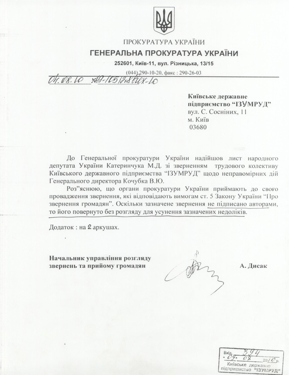 Каково же было удивление, когда через несколько дней депутат Катеринчук написал обращение в Генпрокуратуру, мол, Москаленко уволили незаконно, а новый директор – рейдер, захвативший предприятие. Якобы об этом в своем обращение ему сообщил трудовой коллектив. В действительности же, к Катеринчуку никто не обращался и после проверки, проведенной Прокуратурой, рассмотрение нардеповской кляузы было прекращено. Получается, что нардеп, пользуясь своим положением, фактически, покрывал Москаленка. (см.документ)