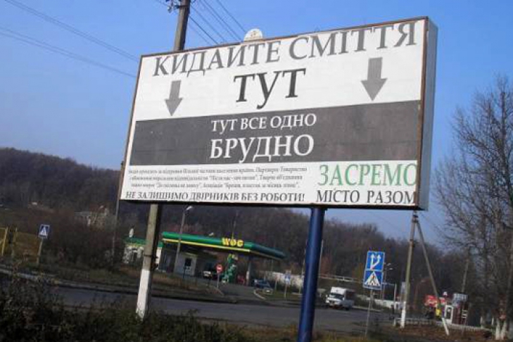 В Ужгороде и некоторых других городах Закарпатья появились рекламные доски, которые креативно привлекали внимание к теме мусора на городских улицах. Исчезли плакаты очень быстро. Как сообщают региональные СМИ, реклама содержала призывы «Бросайте мусор сюда. Здесь все равно грязно», «Не оставим дворников без работы!» и так далее.