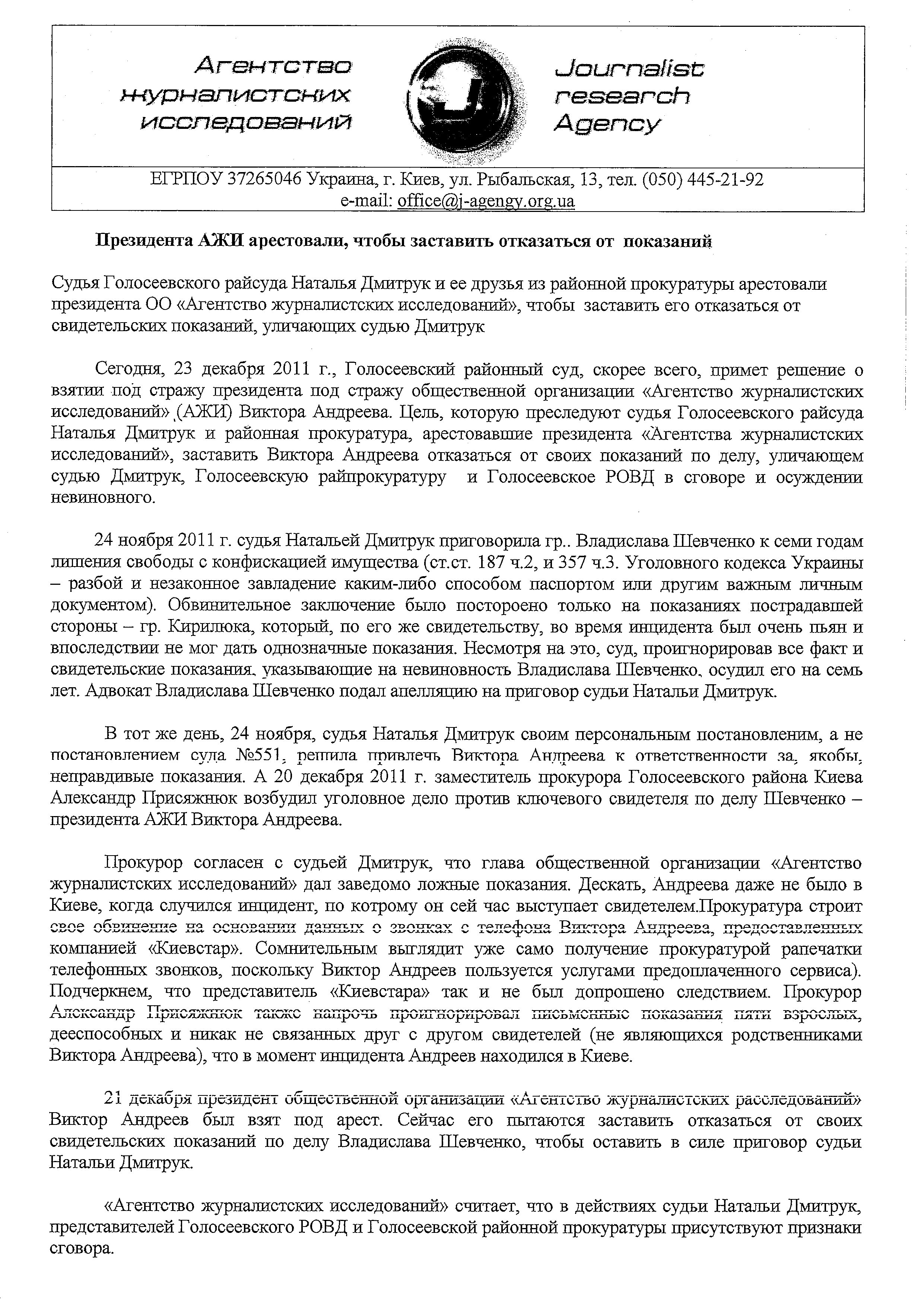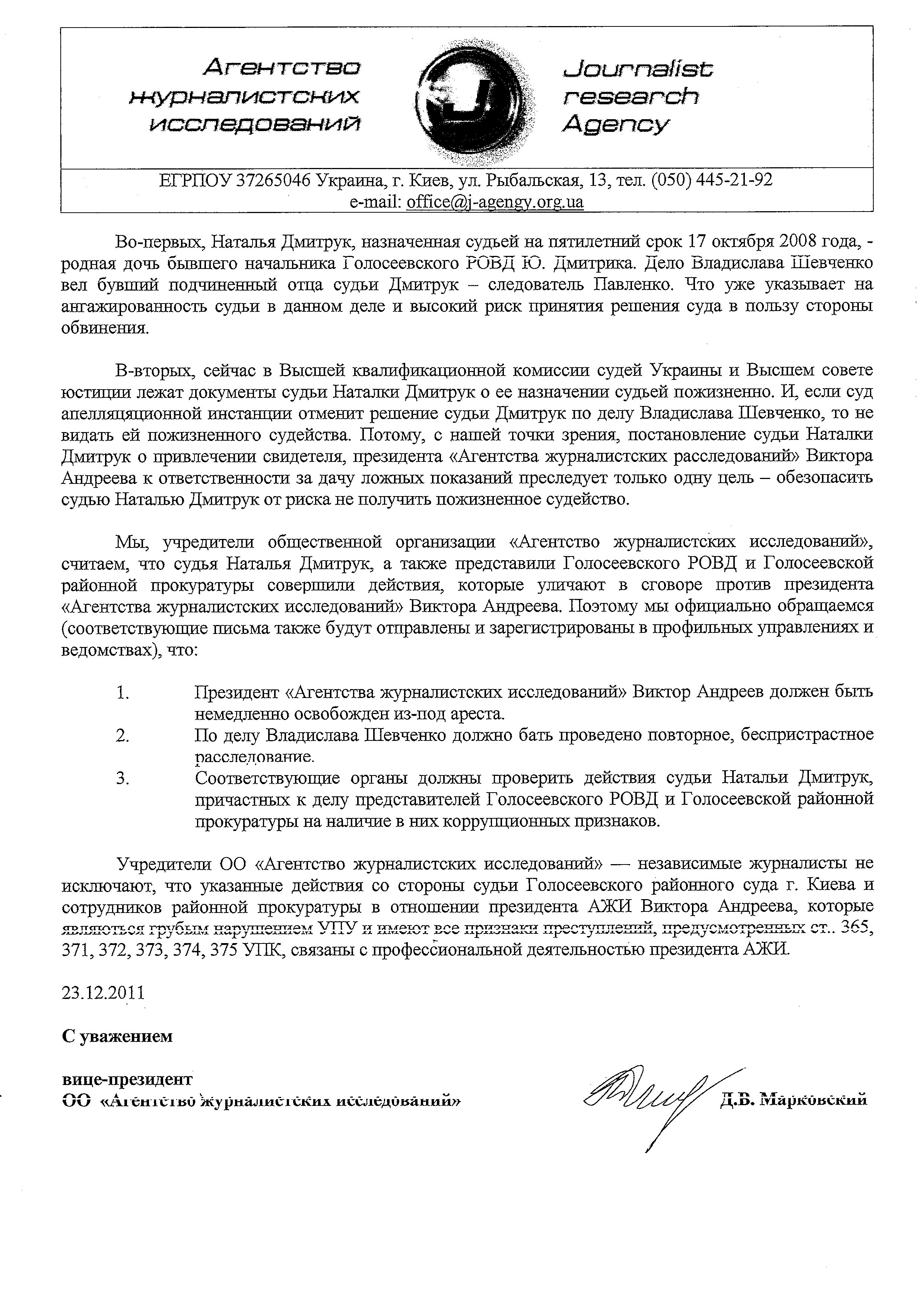 Мы, учредители общественной организации «Агентство журналистских исследований», считаем, что судья Наталья Дмитрук, а также представили Голосеевского РОВД и Голосеевской районной прокуратуры совершили действия, которые уличают в сговоре против президента «Агентства журналистских исследований» Виктора Андреева. Поэтому мы официально обращаемся (соответствующие письма также будут отправлены и зарегистрированы в профильных управлениях и ведомствах), что: