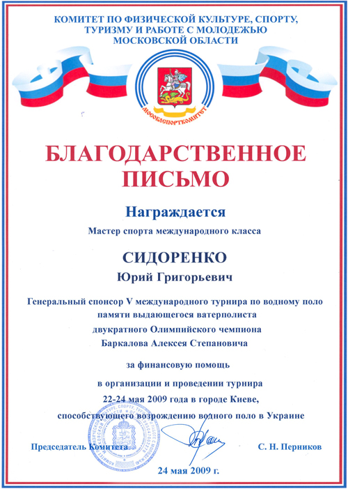 В письме Комитет выразил слова большой признательности Юрию Григорьевичу как генеральному спонсору V Международного турнира по водному поло памяти выдающегося ватерполиста, двукратного Олимпийского чемпиона, чемпиона мира и Европы, заслуженного мастера спорта СССР, заслуженного тренера Украины Алексея Степановича Баркалова.