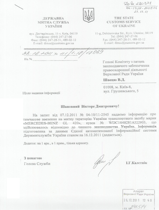 Немногим ранее мы писали о том, что этим вопросом занялся Комитет Верховной Рады по вопросам законодательного обеспечения правоохранительной деятельности – глава Комитета направил запрос по поводу машины в адрес Государственной таможенной службы Украины. В документе за подписью главы Гостаможслужбы Игоря Калетника значится, что до того, как авто было конфисковано, водитель Георг Фогель на угнанном автомобиле дважды по «зеленому коридору» въезжал и выезжал из Украины, и лишь на третий раз «Мерседес Бенц» GL 420 был конфискован, а Фогель предстал перед судом (см. фото документов ниже).